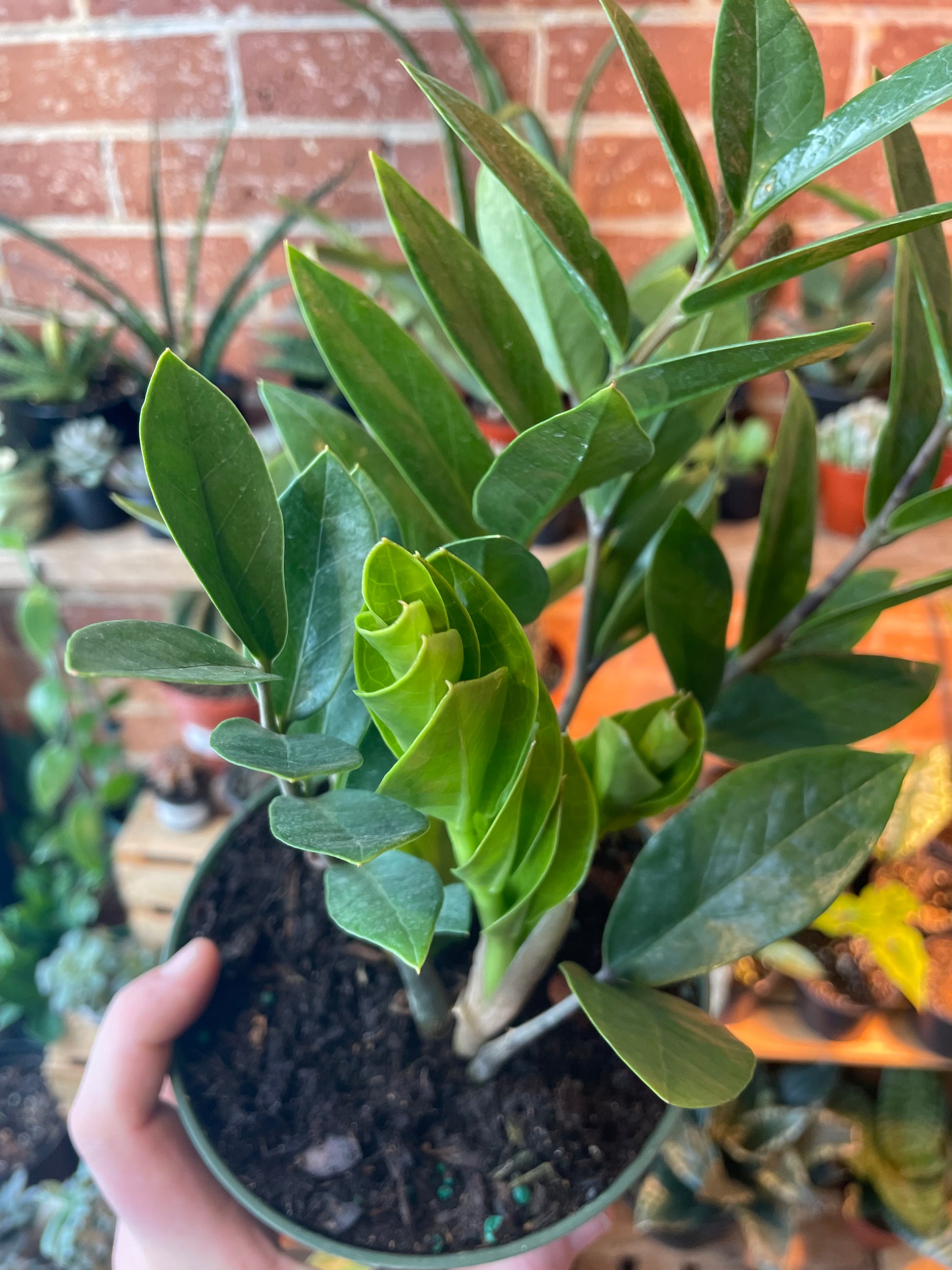 Thrives in bright indirect light, but it can handle low light conditions too. They are hearty, beautiful, so neat to watch grow, and they don't need a ton of water so you can neglect it if you need to. Good old easy ZZ.